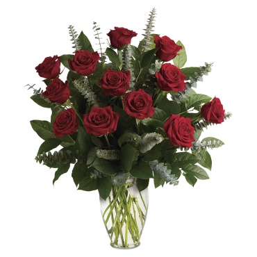 Proclaim your eternal love with this breathtaking bouquet! One dozen resplendent red roses, gathered with alluring greens in a classic glass vase, is a romantic gift she won't soon forget.