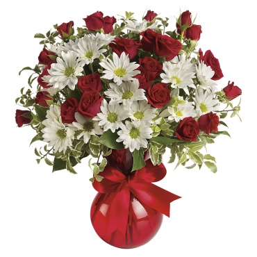 Fly your colors! A festive red ribbon wraps up this sweet bouquet of red roses and white daisies. This loving gift is presented in our shapely red vase your special someone will adore all year long.
