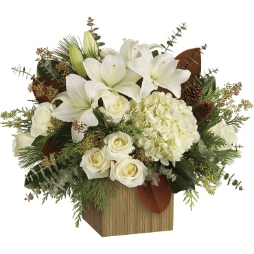 Give the gift of modern winter-white style with this breathtaking bouquet, hand-arranged in a chic bamboo cube.